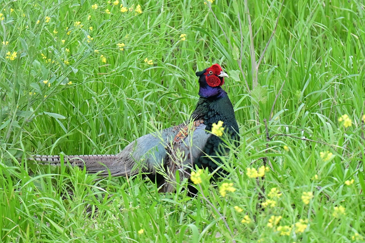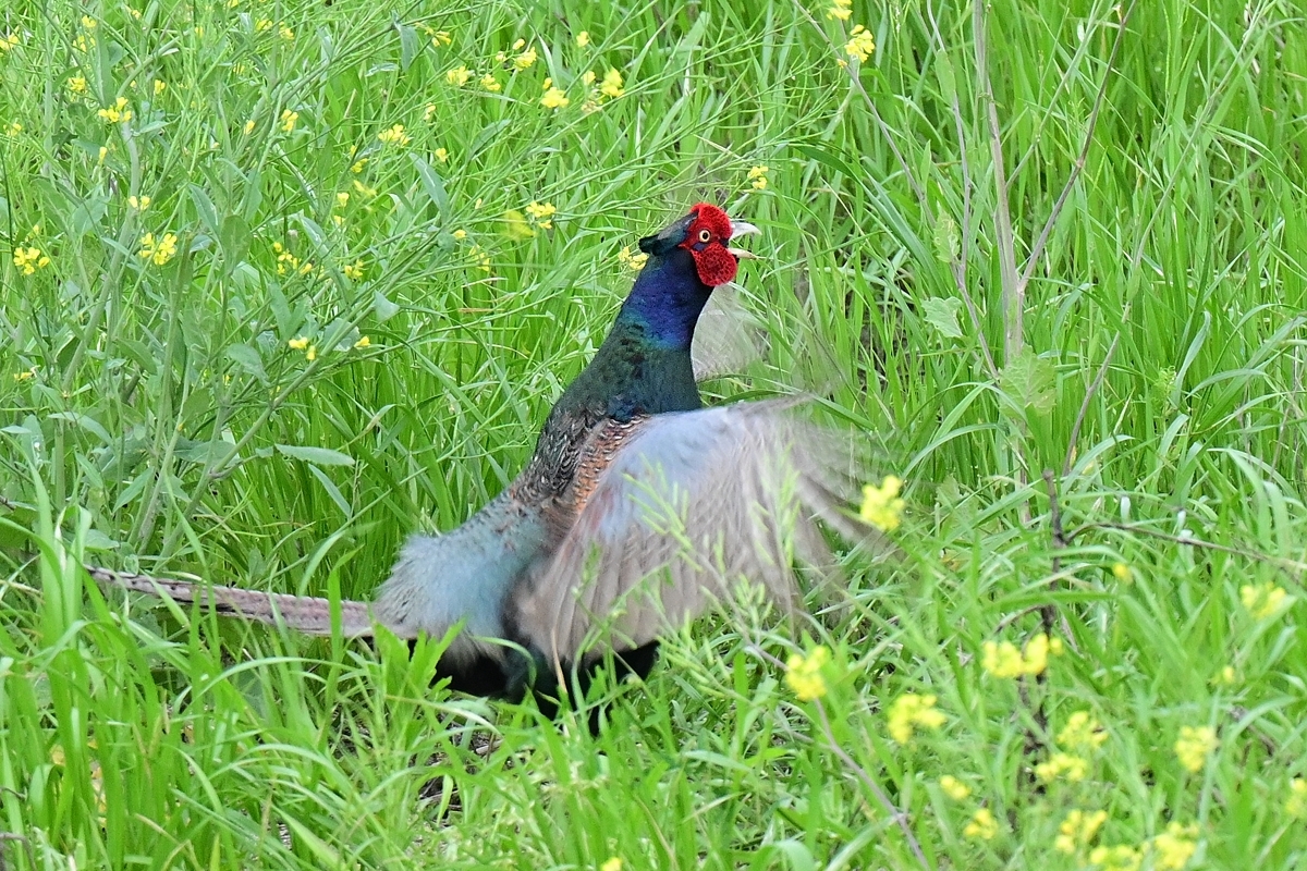 まだ残る菜の花の草むらで、羽ばたきながら大きな鳴き声を