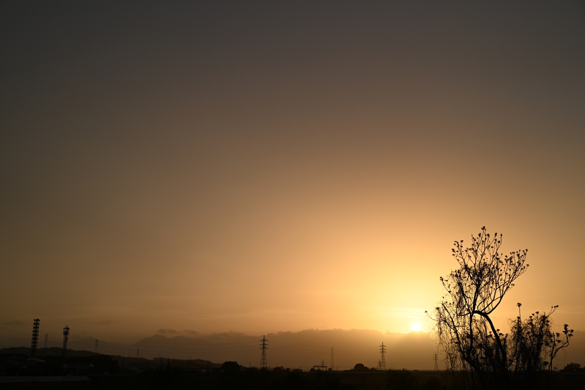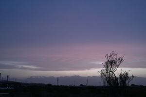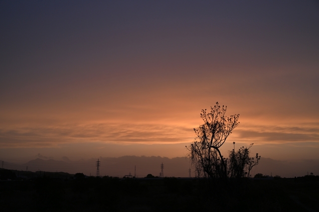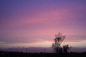 | 南岸低気圧が東に去って、日没前に低気圧後面の高層雲の 西縁の青空が見えてきました。日没前後に高層雲の雲底に 夕陽が差し込むことが予想され、夕焼けの変化を撮影しました。 幻想的なオレンジ色からピンク色への変化がとても見事です。 |