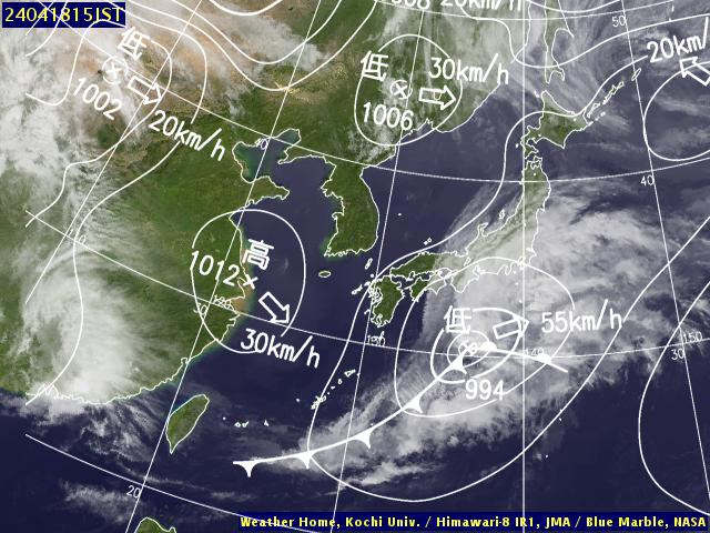 | 地上(高知大学気象情報頁赤外画像と気象庁速報天気図を合成) | |||