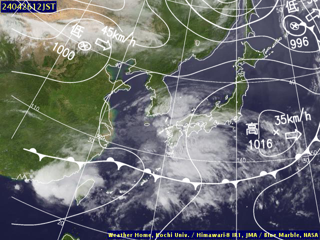 | 地上(高知大学気象情報頁赤外画像と気象庁速報天気図を合成) | |||