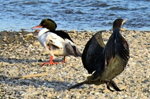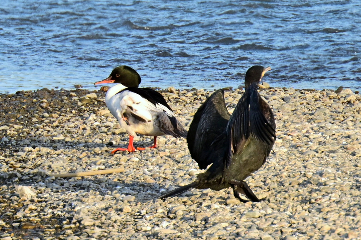 カワアイサ(オス) と カワウ