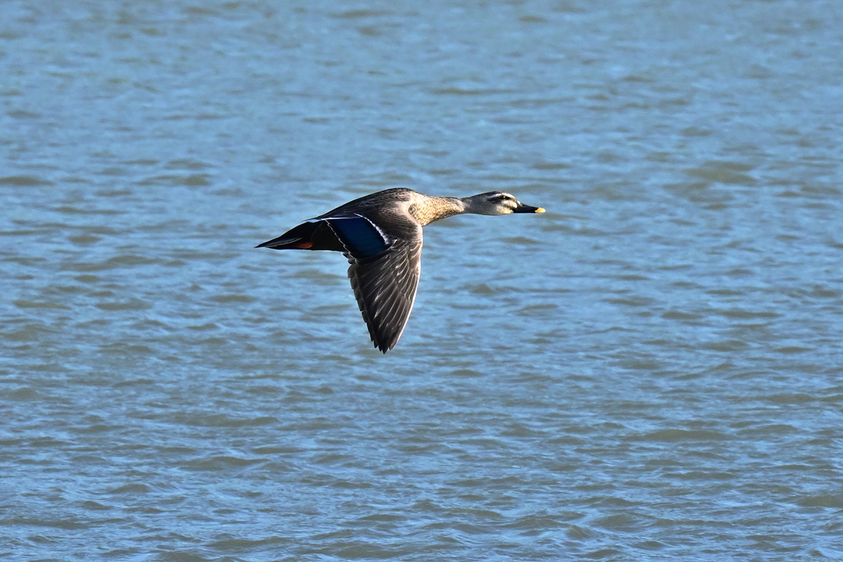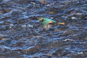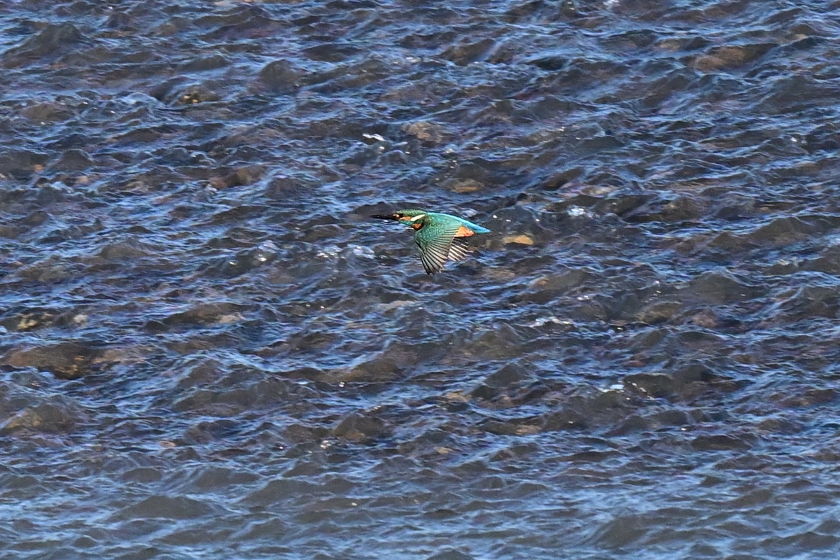 | カワセミ 対岸から飛んでいくシーン。 かなり遠方。最近の活動場所らしい。 |