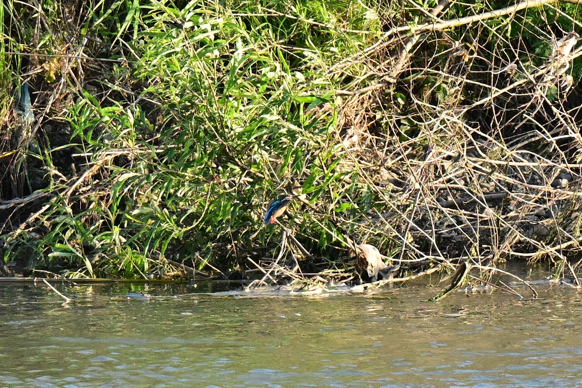カワセミ 100m以上先の対岸。ここに 何度も戻ってきた。 |