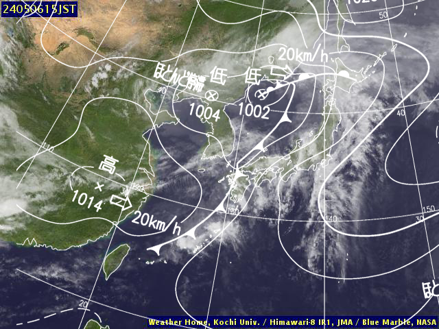 (高知大学気象情報頁赤外画像と気象庁速報天気図を合成)