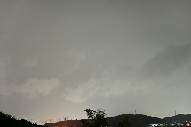 | 南岸の停滞前線に低気圧が発生し、日本海には寒冷渦が残って、 南北に長い降水エリアが生じています。日中は南寄りの風で 小雨が断続的に降る天気で、夜になって本降りになりました。 |
