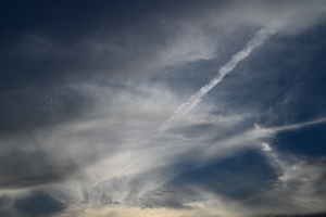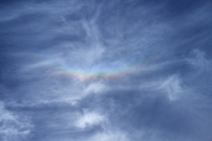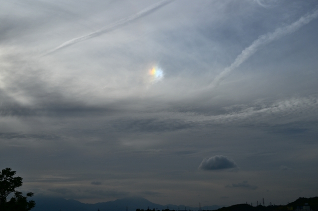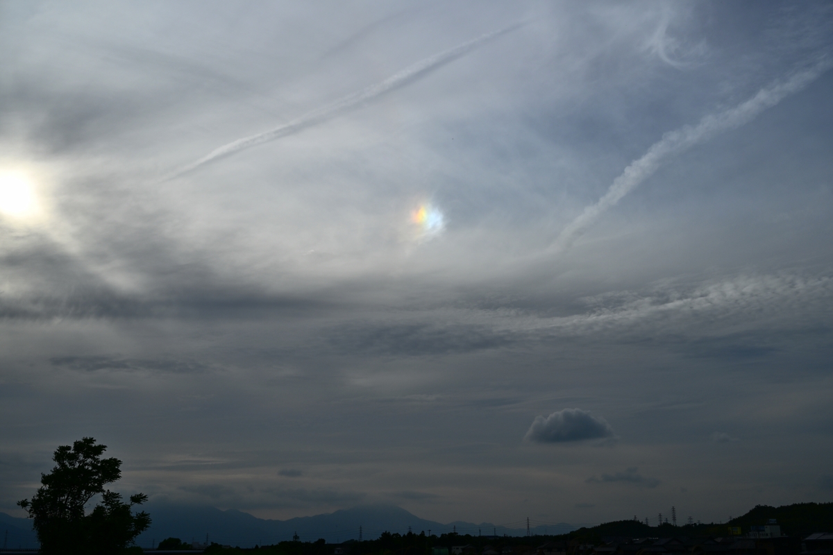 | 梅雨のはしりを思わせる南岸の停滞前線に伴って、上層・中層・ 下層の雲が混在し、青空も見える複雑な空になりました。 昼頃には上層の巻層雲が見えて、みごとな22°ハロ。 夕方には、一部の上層雲に幻日がゆっくりと明滅し、 短時間ながら、鮮やかな環天頂アークも見られました。 |