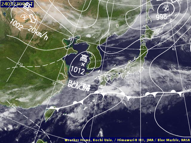 | 地上(高知大学気象情報頁赤外画像と気象庁速報天気図を合成) | |||