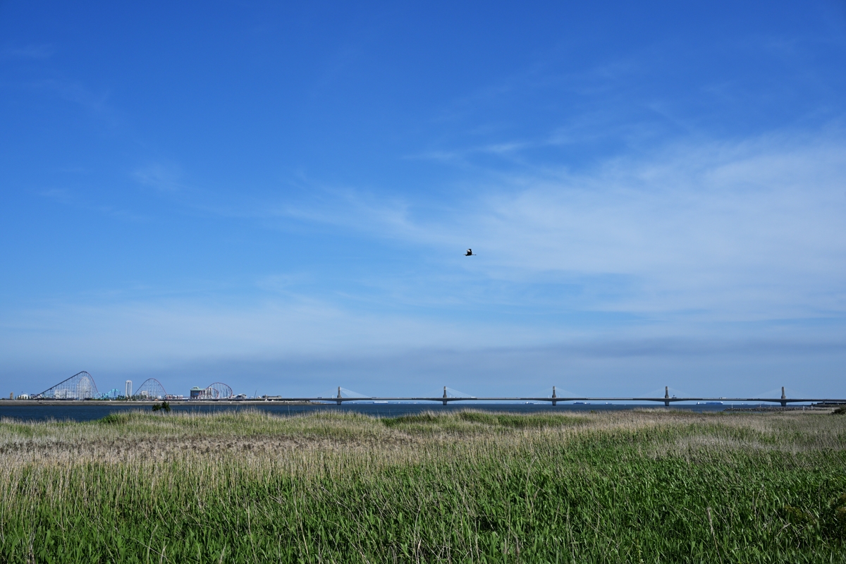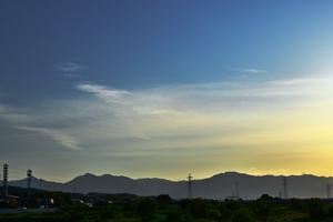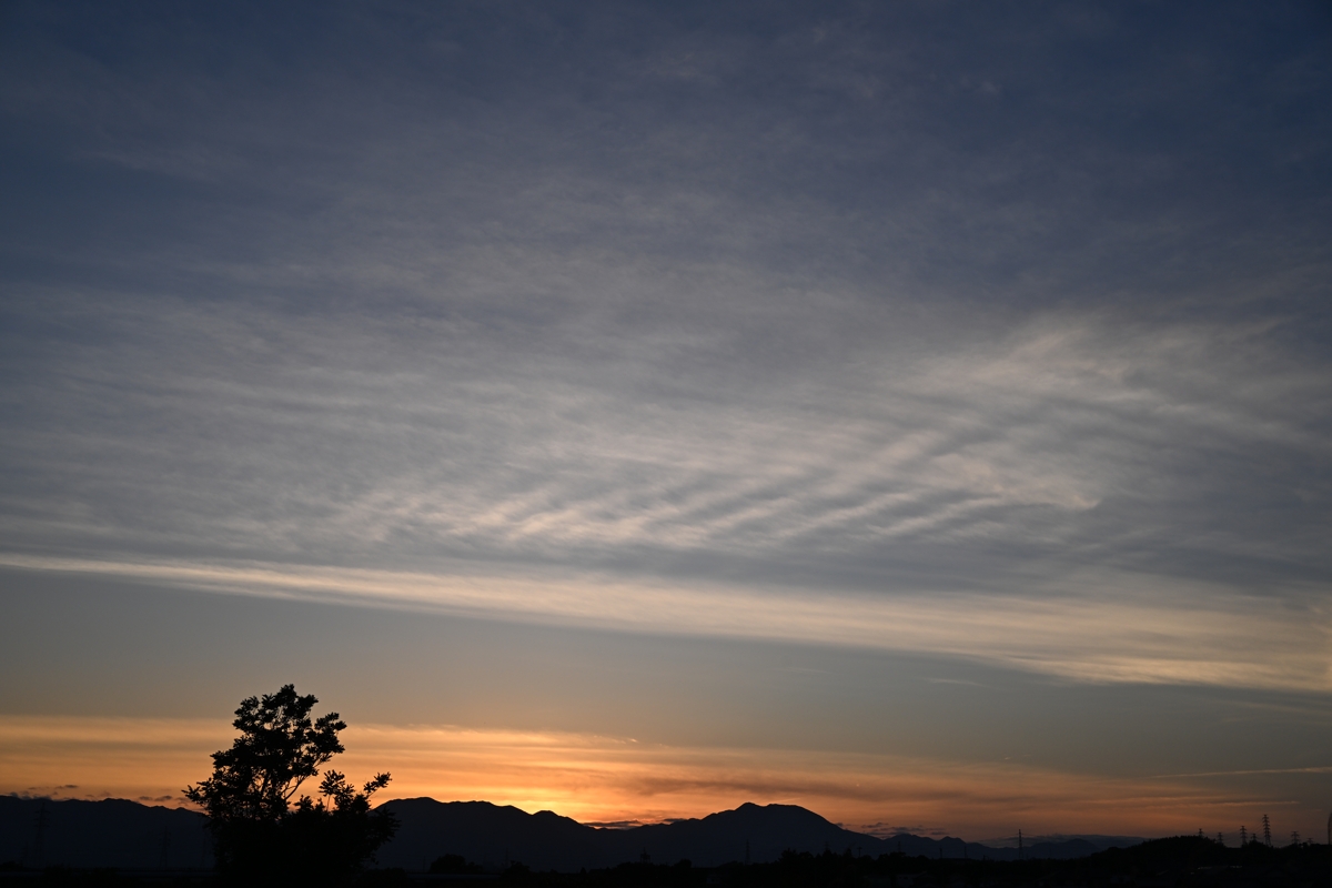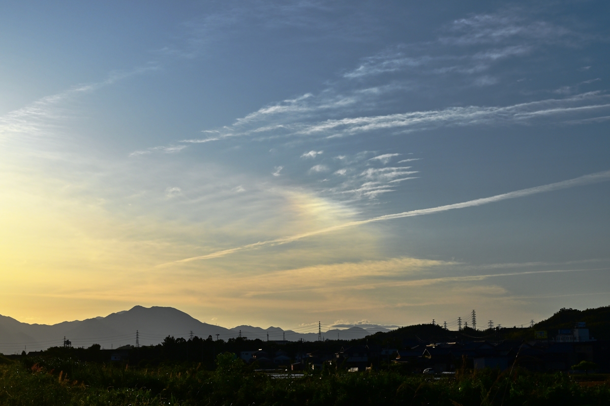 移動性高気圧におおわれてきて、朝から快晴の天気。最高気温 (桑名)も29.3℃まで上昇しましたが、風が涼しくさわやかな陽気でした。 午後、青空のもと、南の低空を通過する巻層雲もさわやかな景色。 夕方、日没前には西から巻層雲がやってきて、幻日が見られました。 |