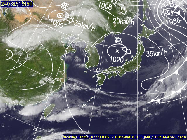 | 地上(高知大学気象情報頁赤外画像と気象庁速報天気図を合成) | |||