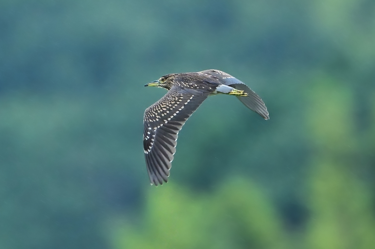 強まる雨を合図にしたかのように飛び立ったゴイサギの幼鳥