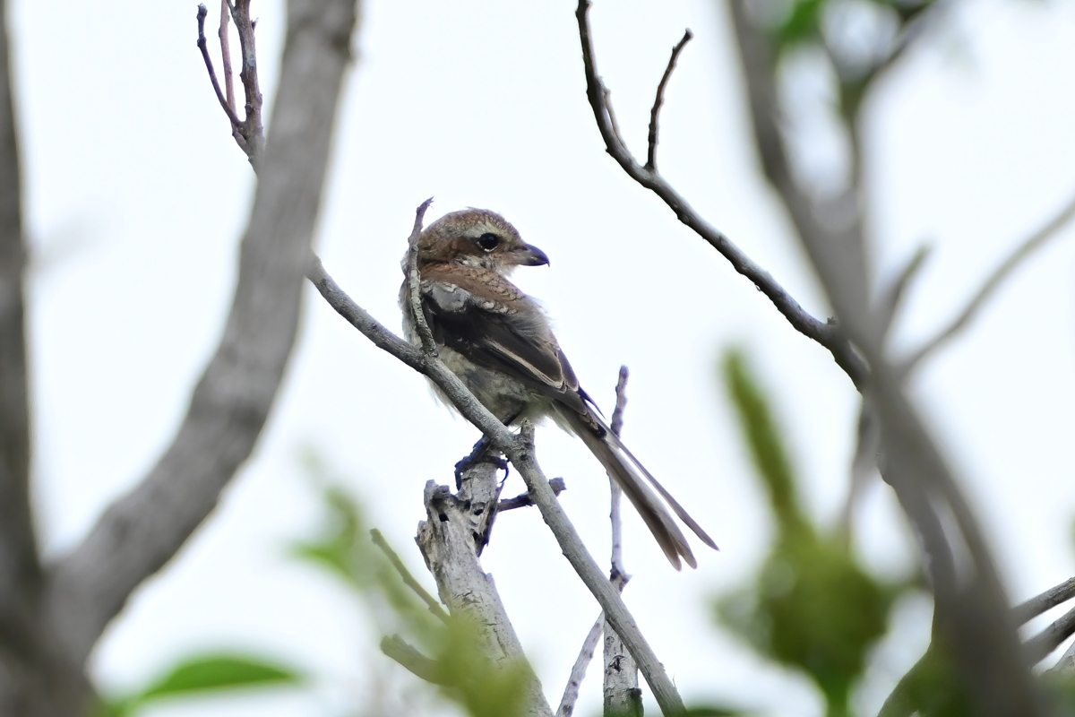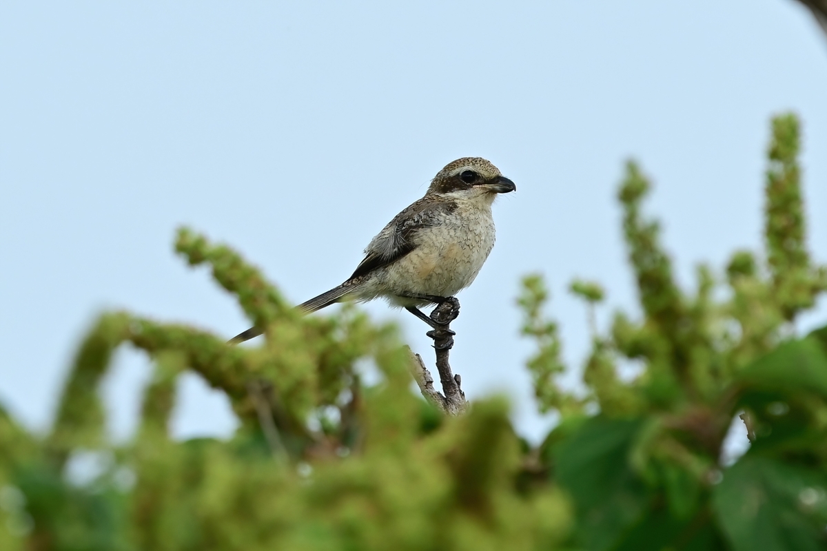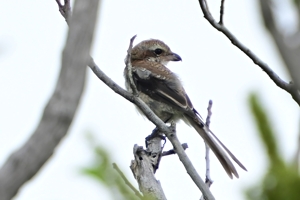 | 夕方の員弁川にて。 堤防上の樹木にモズの仲間たちが頻繁に来て、高鳴きすることも。 夏の羽をしたモズと幼鳥などが混ざっていて、いずれも秋冬に 見られるモズらしいモズとはずいぶんと印象が違っています。 (後日記:この日を境にして、なぜかこの樹木にはモズがあまり来なくなりました。) |