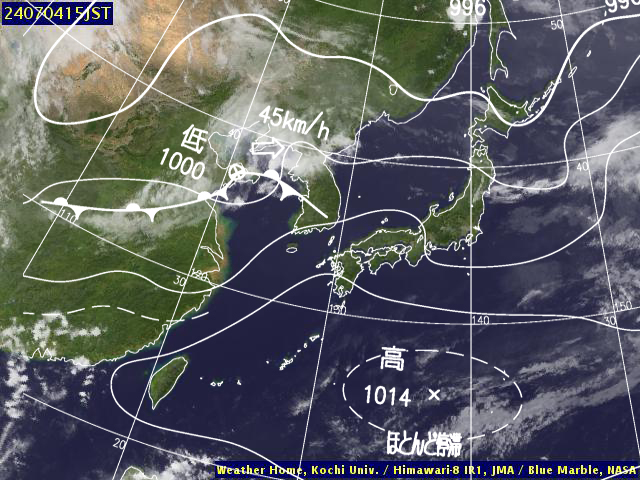 | 地上(高知大学気象情報頁赤外画像と気象庁速報天気図を合成) | |||