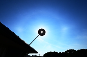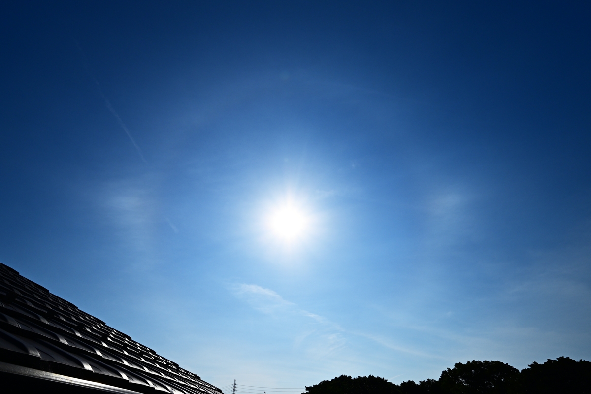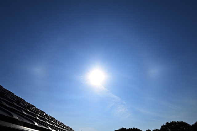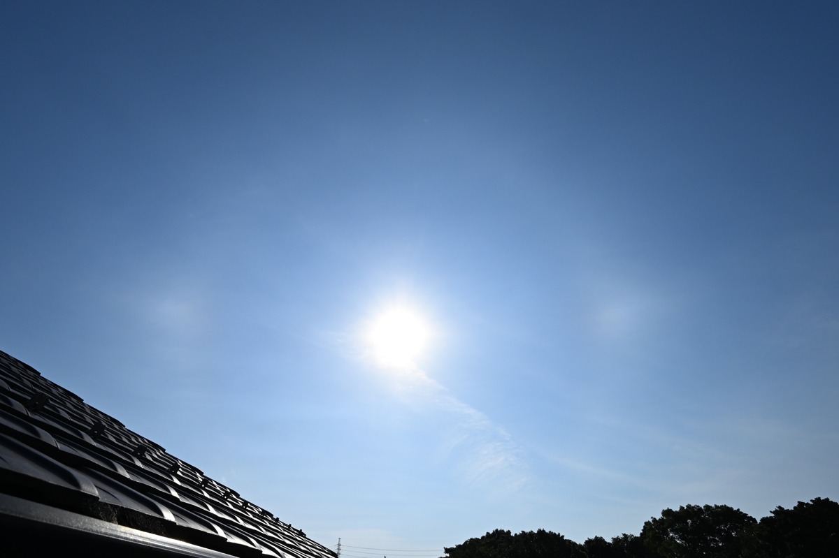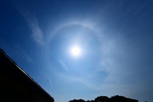 | 今日も当然のように猛暑日。桑名では37.5℃。 静岡などでは40℃に達しました。 朝は青空に見えるようなごく薄い巻層雲が太陽にかかって、 ぼんやりとした感じのハロと両側の幻日があらわれました。 なんとなく、ピラミダル氷晶のハロが見えるときのようなハロの 見え方で、暑さをこらえて観察するも特別なハロはありませんでした。 その後、やはりほぼ青空のような巻層雲に長時間22°ハロが 継続し、夕方には両側の幻日がギラギラという感じで明るく輝きました。 |