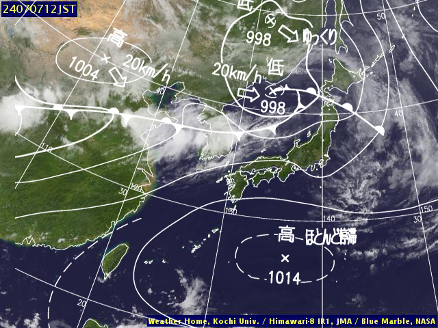 | 地上(高知大学気象情報頁赤外画像と気象庁速報天気図を合成) | |||