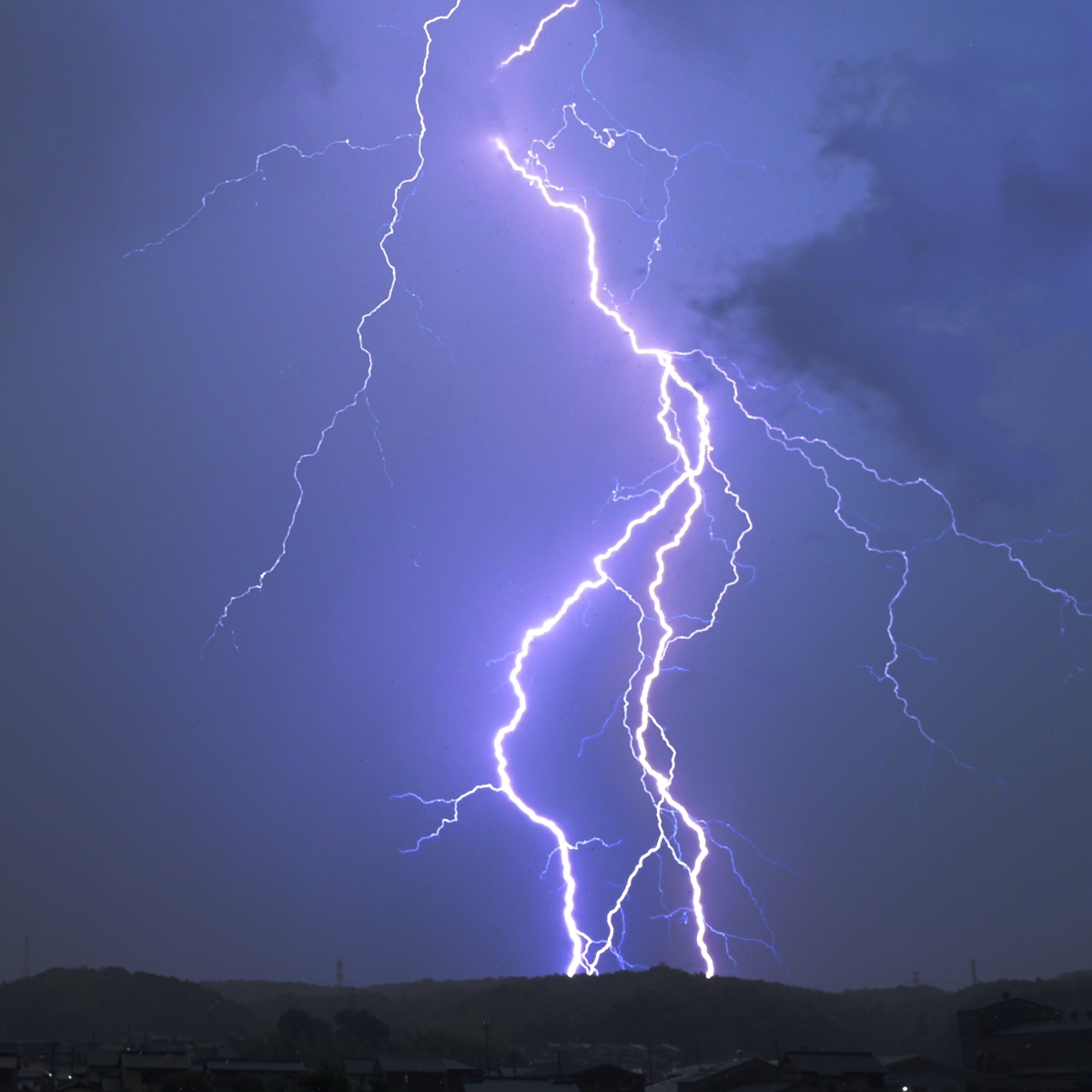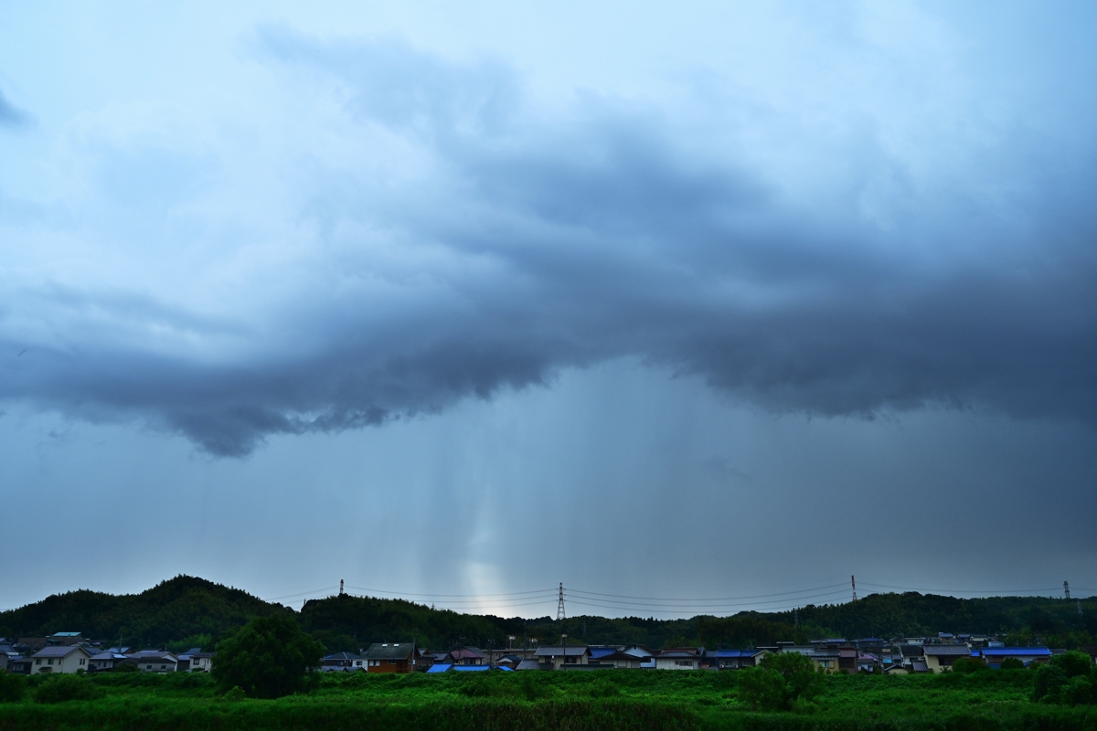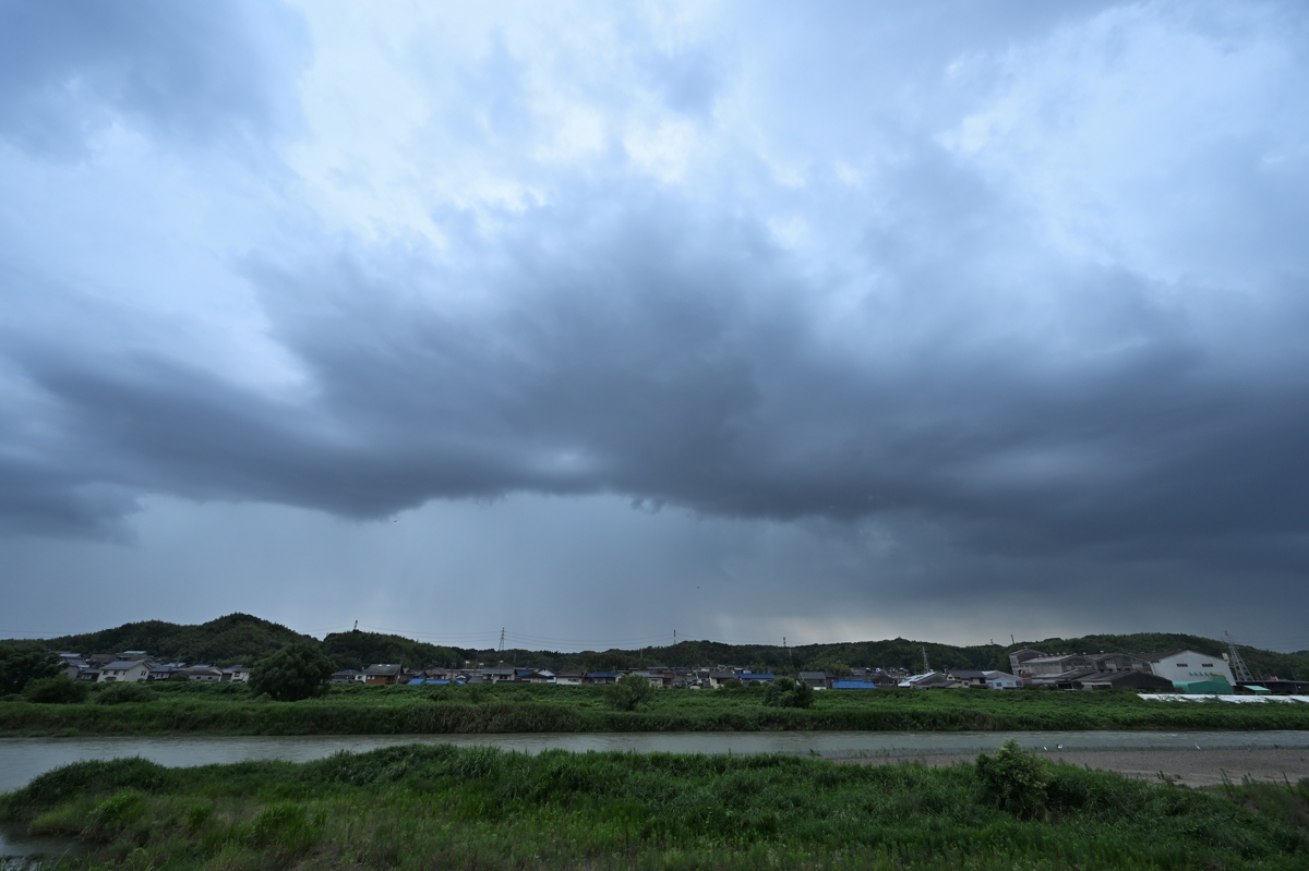| 梅雨前線の南側にあって、大気の状態は不安定。 京都・滋賀方面で発生した積乱雲が東方に移動し、桑名では 南にあるアーチ雲といってよさそうな雲がその奥に降水雲を 伴い、東に移動しながら南からじわじわと近づいて来ました。 降水雲の奥に見えてきた雷光や雷鳴もじわじわと接近してきて 本降りになるころには観察地の周辺も雷の活動域となりました。 雷の撮影は、シャッター速度1/25秒、24コマ/秒連射で、 掲載写真は、連続する3コマを比較明合成したものです。 |