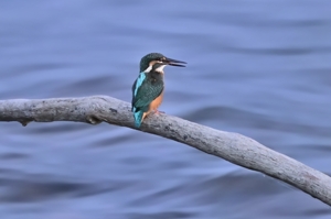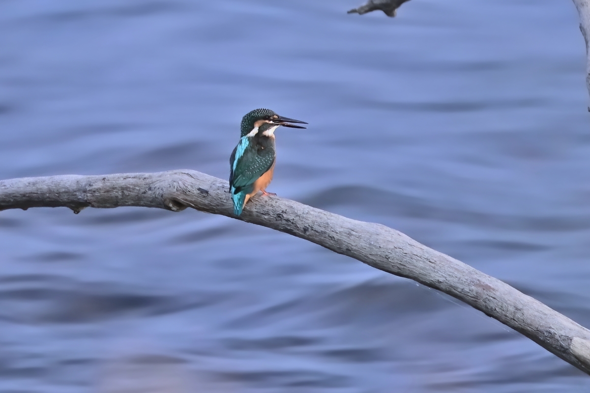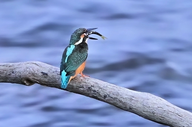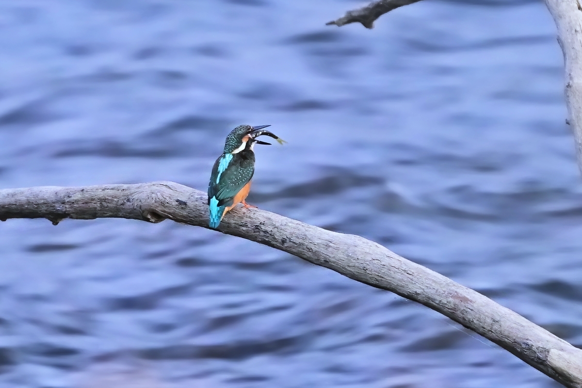 日没後の員弁川にて。 山脈への日没から25分後、完全日没から15分後ころ、 カワセミ幼鳥が川面に突き出た樹木の枝に留まりました。 肉眼での視認も難しい明るさでしたが、超スロシャッターにして 川の流れを幻想的に表現してみました。魚を呑み込む シーンはやや速めの1/45秒にしています。 |