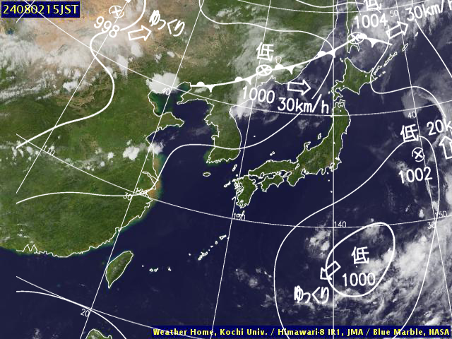 | 地上(高知大学気象情報頁赤外画像と気象庁速報天気図を合成) | |||