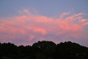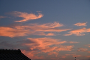 | 張り出していた北太平洋高気圧の勢力が弱まるも、 今日もよく晴れて最高気温35.8℃の猛暑日です。 夕方は、房状の巻雲がびっしりと集まって西から現れ、 日没後はオレンジ色からピンク色に変わる夕焼けでした。 |