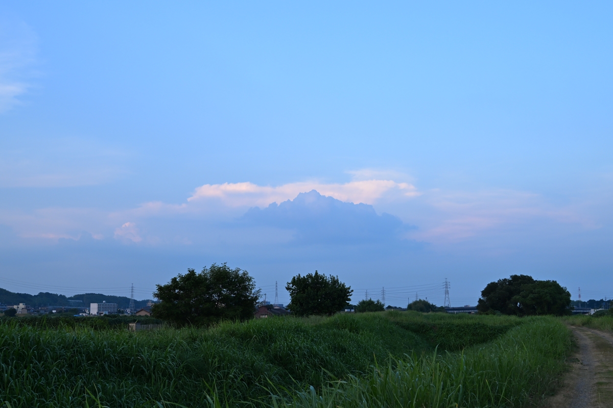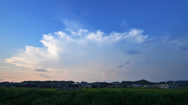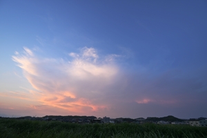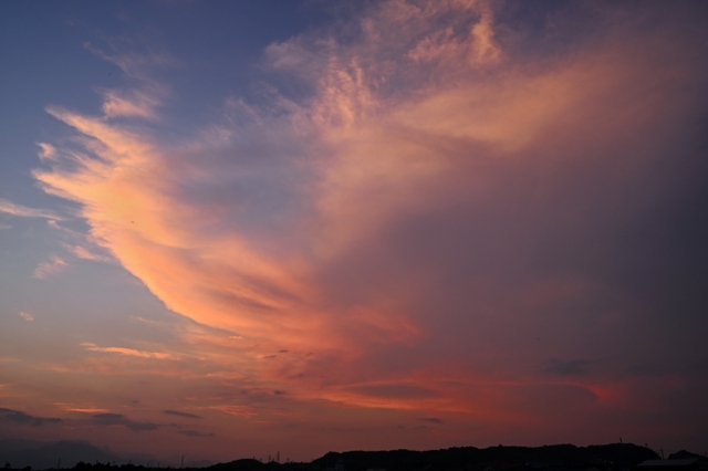 今日も最高気温(桑名)が37.0℃の猛暑日。 そして、午後に鈴鹿山脈の亀山方面で積乱雲。 夕方には、飛騨方面と京都方面の積乱雲から大きく 広がるかなとこ雲が夕焼けに染まっていきました。 |