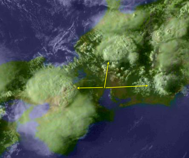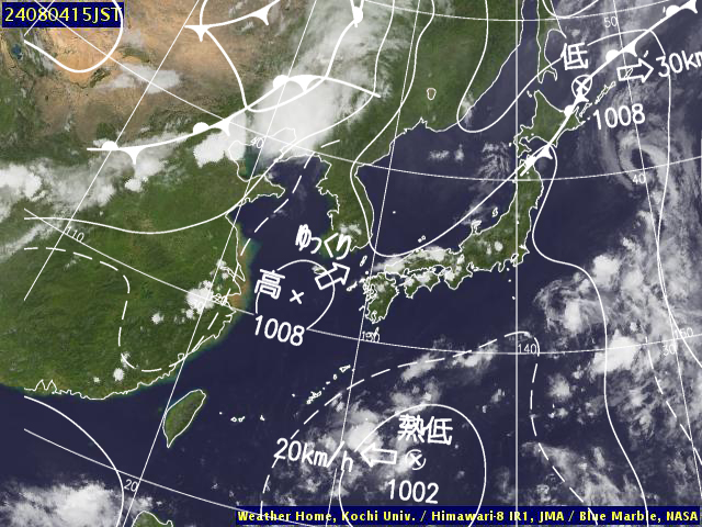 | 地上(高知大学気象情報頁赤外画像と気象庁速報天気図を合成) | |||