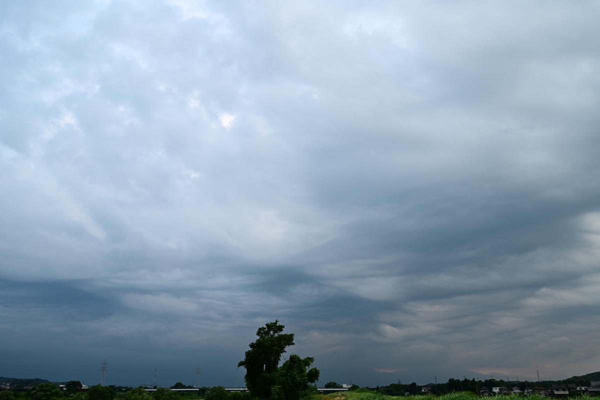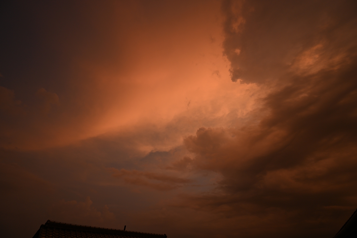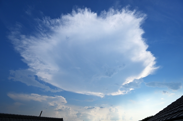 最高気温(桑名)は37.5℃。いつまでこの猛暑が続くのでしょうか・・・。 今日も各方面の積乱雲が発達し、そのほとんどがかなとこ雲を作りました。 上層の風が弱いようで、かなとこ雲の形状は円形。 15時30分頃に雷鳴が聞こえ始めて、西の空、眼前にそびえたつ積乱雲が 見えました、濃密な降水雲を伴っていましたが、観察地には雨は来ず。 そして、積乱雲の本体が消滅すると、濃密で丸いかなとこ雲が残りました。 遠方でこのような雲を見ることはよくあるけれど、覆いかぶさる近さで見る Cb本体の無いかなとこ雲は、大迫力でした。 |
