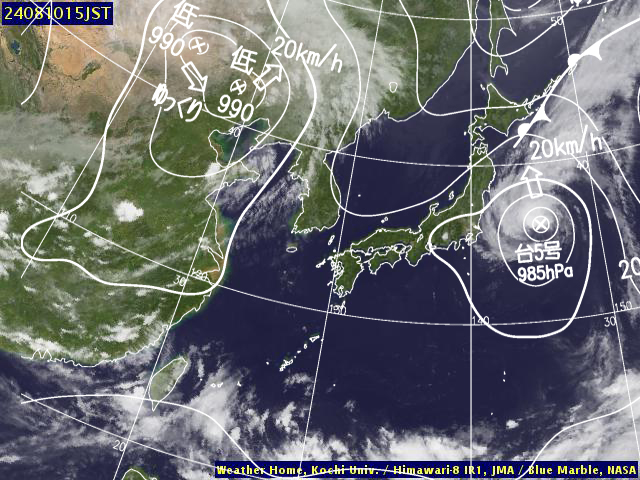 | 地上(高知大学気象情報頁赤外画像と気象庁速報天気図を合成) | |||