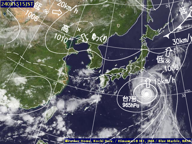 | 地上(高知大学気象情報頁赤外画像と気象庁速報天気図を合成) | |||
