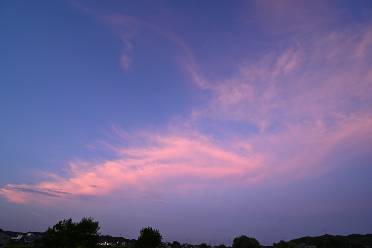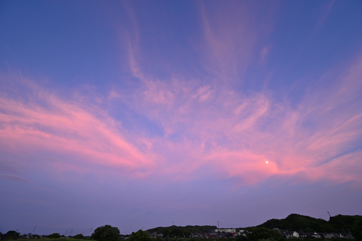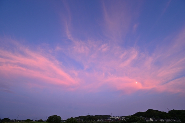 | 桑名の最高気温は38.1℃、23日連続の猛暑日。 台風7号は強い勢力で関東沖を北上。その縁辺のものと思われる 上層雲が東からあらわれ、ゆっくりと西進して夕焼けに美しく染まりました。 |
