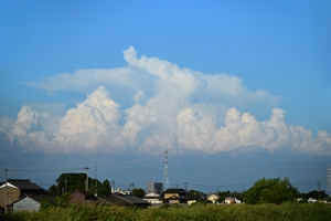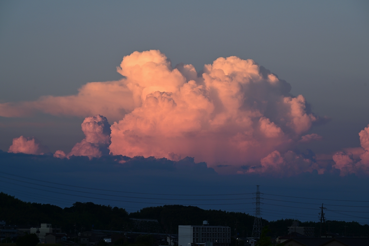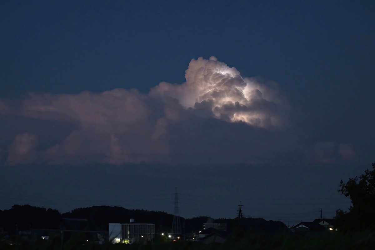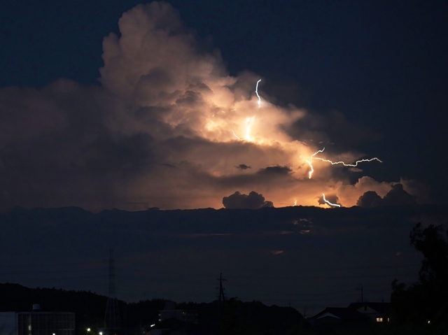 | 夜半を過ぎると、おうし座のプレアデス星団(M45、和名:昴)が東の 空に昇ってくるようになりました。台風7号の影響か、夜空の透明度が とても高く、美しい星空です。2時頃から東の空でひときわ目を引くのが 接近している火星と木星で、おうし座のヒアデス星団の近くにあって とても見ごたえのある星空風景になっています。 さて、気温は朝の6時ころにはすでに約30℃、最高気温も当然のように 38.4℃(桑名)まで上昇、余裕で24日連続猛暑日となりました。 積乱雲の発生は少なかった中で、愛知・岐阜・長野の3県の境界 付近で積乱雲が次々と発生してはすぐに消滅することを繰り返して いたのですが、日没のころになって3つの対流セルが合体したような 積乱雲となり、日没後には雷の光るのがよく見えました。暗くなった 積乱雲が雷の光で灯籠のようにぼわっと光り、稲妻が見えたり するのは、とても幻想的な光景です。 |