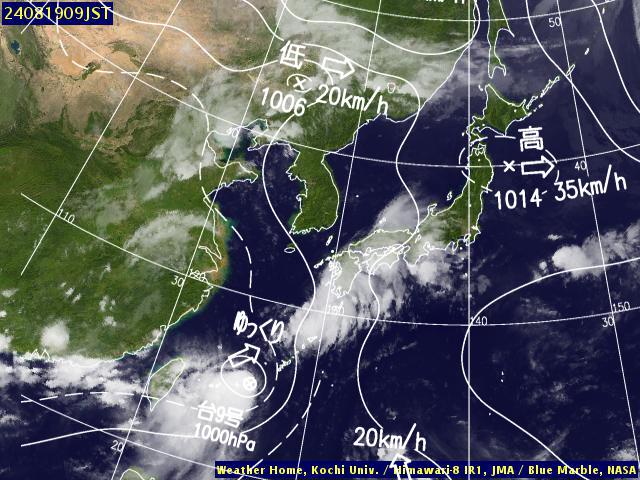 | 地上(高知大学気象情報頁赤外画像と気象庁速報天気図を合成) | |||