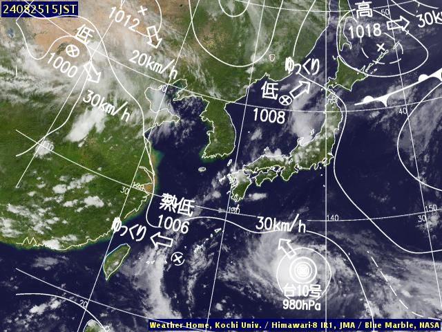 | 地上(高知大学気象情報頁赤外画像と気象庁速報天気図を合成) | |||