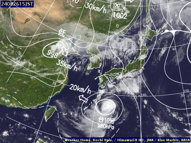 | 地上(高知大学気象情報頁赤外画像と気象庁速報天気図を合成) | |||