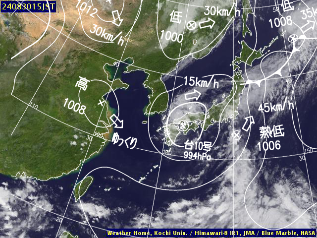 | 地上(高知大学気象情報頁赤外画像と気象庁速報天気図を合成) | |||