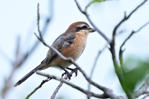川岸の樹木に留まって高鳴きをするモズ(オス)。