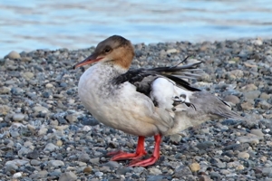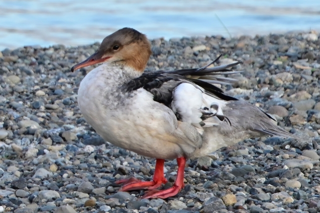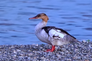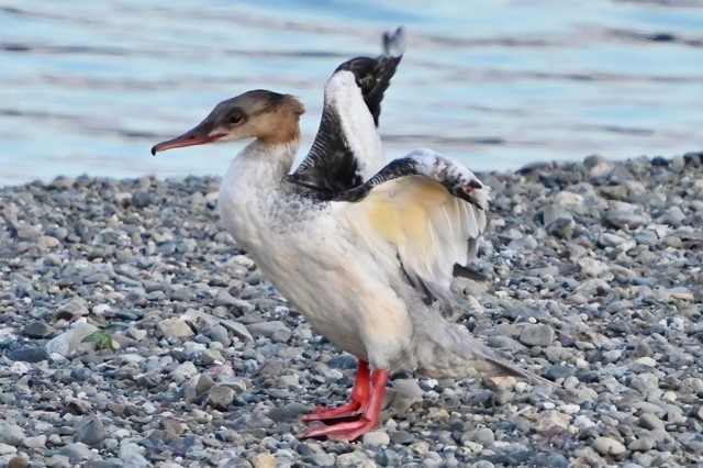 中州にいたカワアイサ(メス)を川岸から撮影。冬鳥なのに、