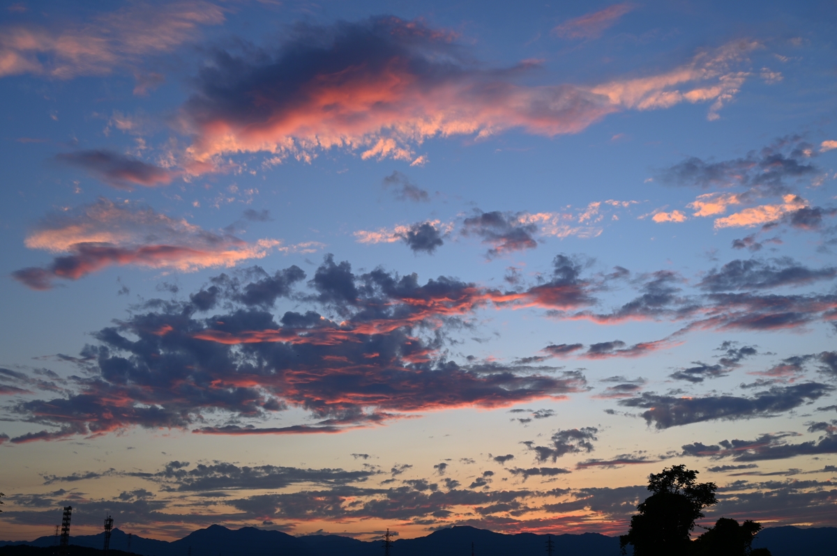 | 台風10号による大雨がつづいていましたが、1週間前までは 積乱雲だらけの日々。今日も関東などでは積乱雲の豪雨が 報じられていましたが、前線も南下して三重県では高積雲と 層積雲が重なる穏やかな空。美しい夕焼けも見られました。 |