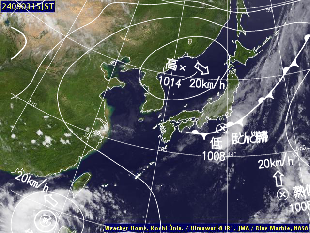 | 地上(高知大学気象情報頁赤外画像と気象庁速報天気図を合成) | |||