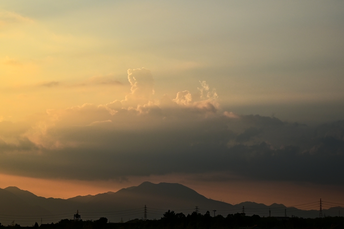 | 高気圧に覆われ、午前に多くあった積雲が消えた午後、 ややヘイズがかった快晴の青空が広がりました。 夕方、青空に現れたのは人為起源雲の積雲。 火力発電所付近からの水蒸気が原因です。 また、地形性の層積雲が湧き出すように現れました。 鈴鹿山脈付近にも層積雲が濃くなり、塔状に立ち上る いくつもの雲が印象的でした。 |