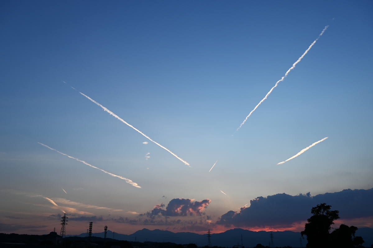 | 夕方、ひたと東の遠方に発達しきらない積乱雲。雲頂付近に 氷晶は生じているようだが雄大雲との判別は難。(雷情報不明) 日没後、鈴鹿山脈の積雲の上、赤くなって広がった飛行機雲に かさなって、細い月(月齢2.3)と金星が接近して見られました。 |