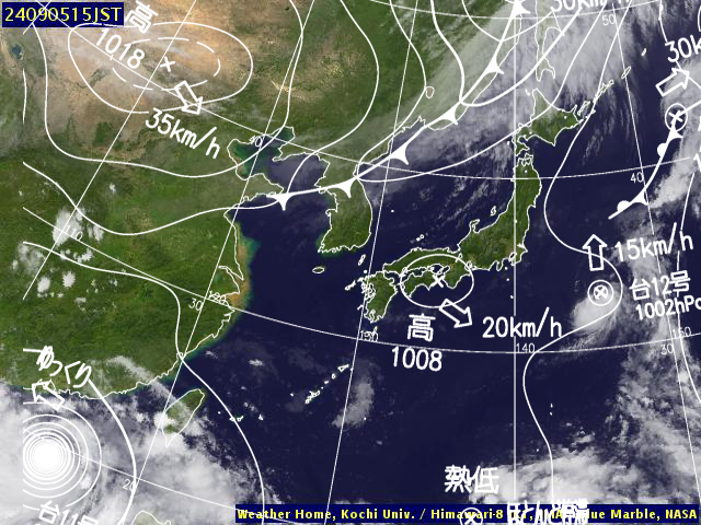 | 地上(高知大学気象情報頁赤外画像と気象庁速報天気図を合成) | |||
