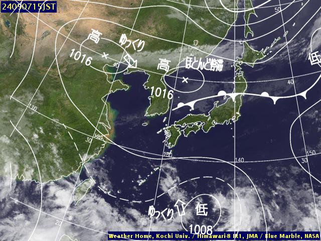 | 地上(高知大学気象情報頁赤外画像と気象庁速報天気図を合成) | |||