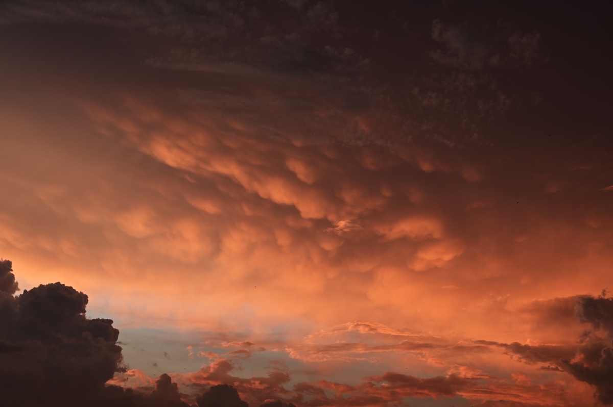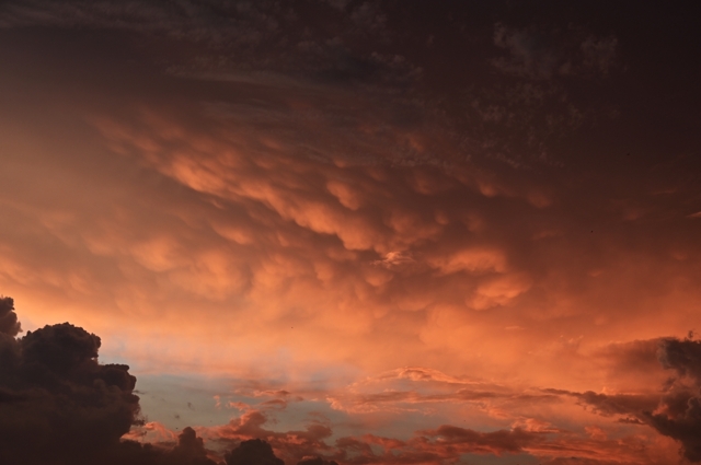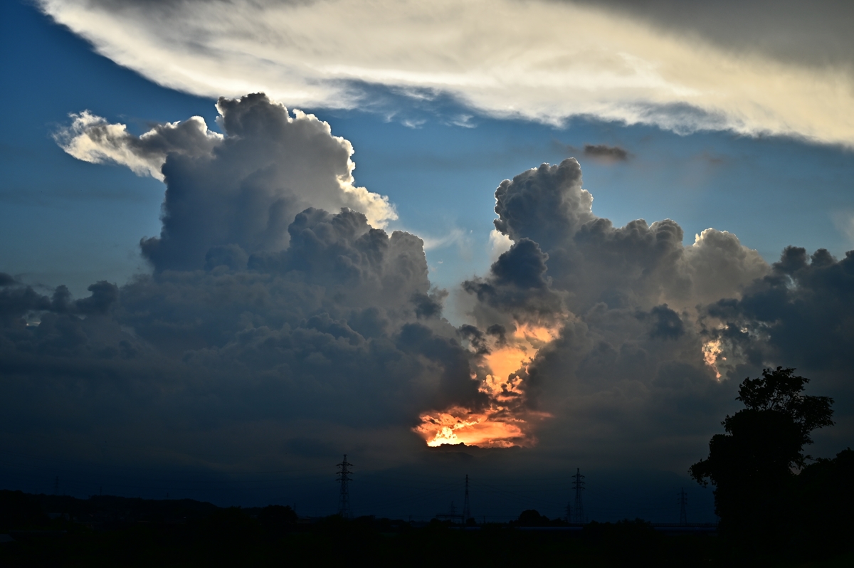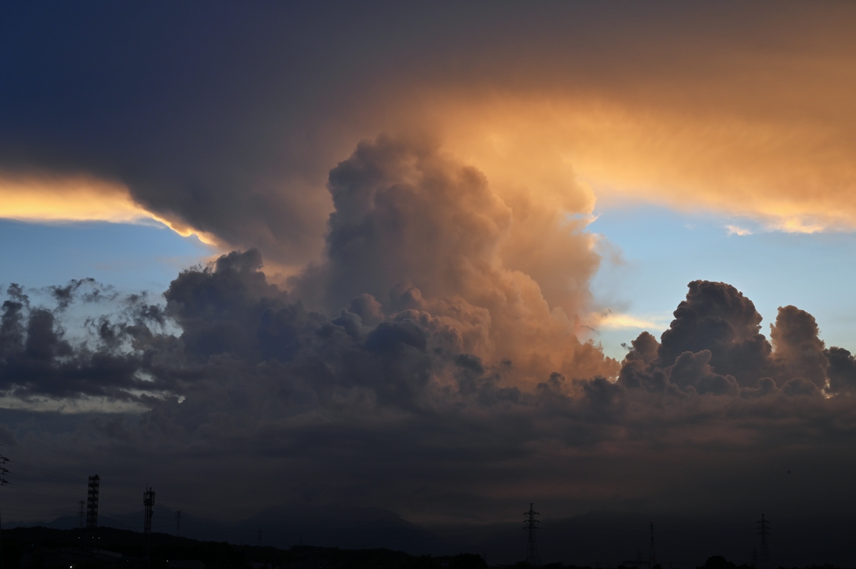 | 16時ころに岐阜県西濃方面で積乱雲が発達し、そのかなとこ雲が 三重県にまで広がってきました。積乱雲本体は他の雄大雲などに かくれましたが、滋賀県方面の積乱雲群は雲頂がこのかなとこ雲に 合体してしまう様子が夕陽を浴びて迫力ある風景になりました。 また、かなとこ雲の一部には夕陽で赤く染まった乳房雲も。 日没後には、北東から西方にかけて、4つほどの積乱雲が 雷を光らせていました。 |