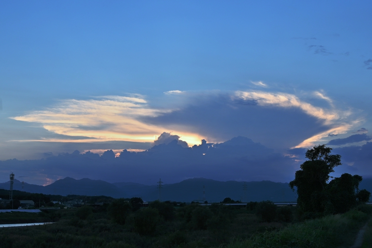 | 午後、北東から北にかけての空で、積乱雲や雄大雲がいくつか消長。 日没頃、西方でシルエットで浮かび上がったのは遠方のかなとこ雲。 京都府方面のもののようです。そして同時に、東の空にはみごとな 反薄明光線! 西方の かなとこ雲のシルエットを投影していました。 |