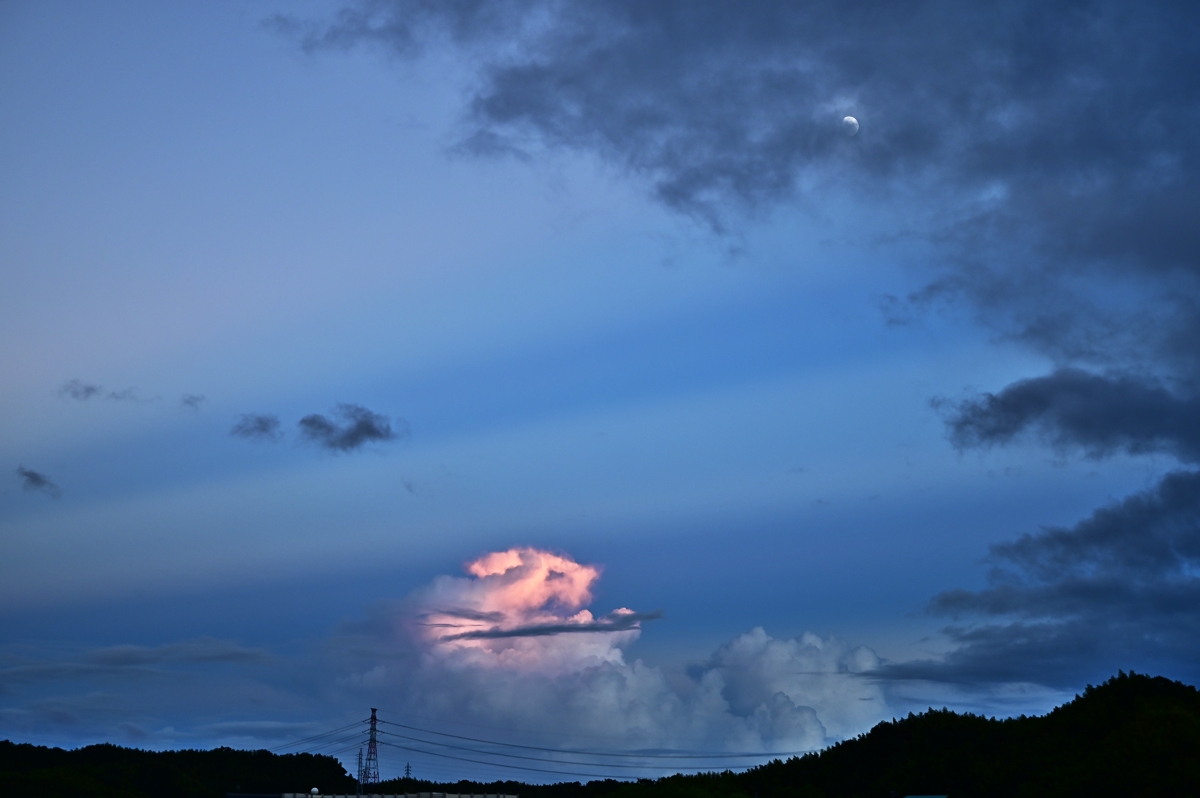 | 台風13号が沖縄方面に接近。台風12号の時と同様に、縁辺流が 三重県の南岸から吹き寄せて、対流性の雲や層状の雲が混ざり 複雑な空でした。雲の下から、遠方の積乱雲があちらこちらに。 日没のころ、南東の積乱雲が全貌をあらわし、夕陽に染まって ゆき、日没後は反薄明光線の空のもとで赤く染まった積乱雲。 上弦過ぎの月もアクセントとなって、とても美しい空の時間でした。 |