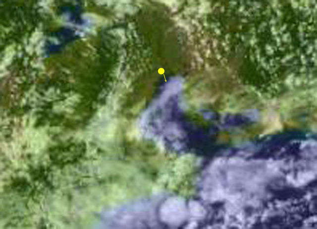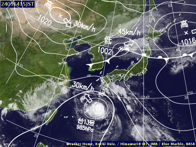 | 地上(高知大学気象情報頁赤外画像と気象庁速報天気図を合成) | |||