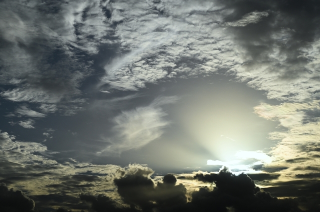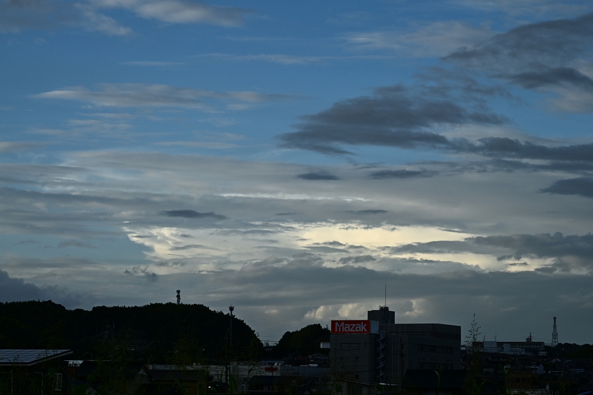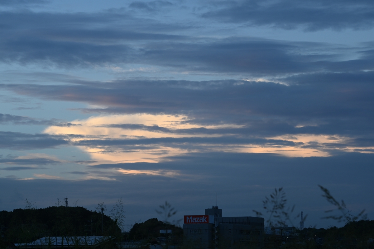 | 台風13号の影響は少なくなり、秋雨前線が北から接近。 高層雲や高積雲と下層雲の入り乱れる空。 穴あき雲とは言い難いものの、落下する尾流雲と 蒸発する高積雲がつくる大きな雲の穴が見られました。 日没頃、北の積乱雲が下層雲に隠されたまま、 夕陽に染まっていきました。 |