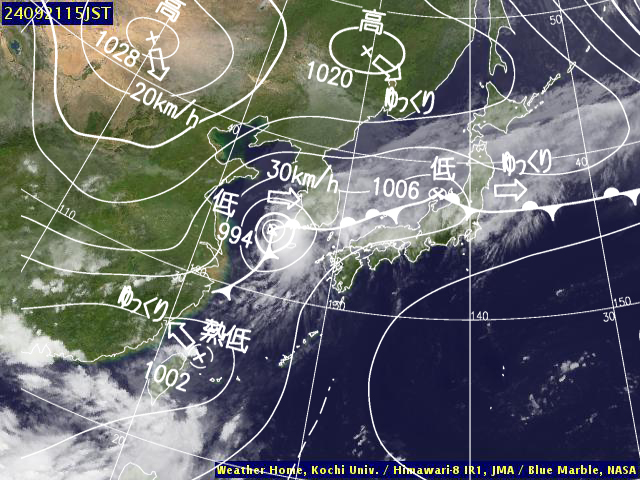 | 地上(高知大学気象情報頁赤外画像と気象庁速報天気図を合成) | |||