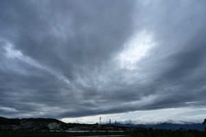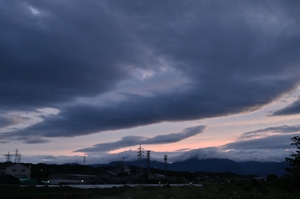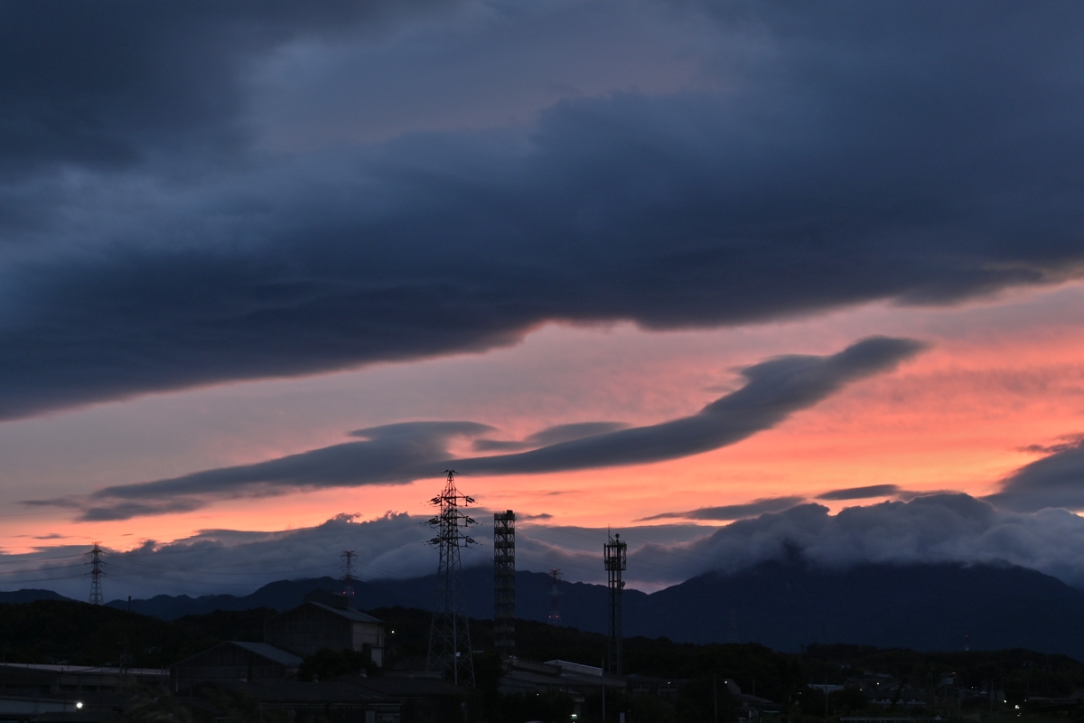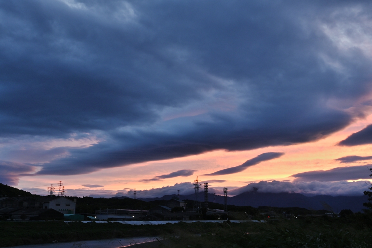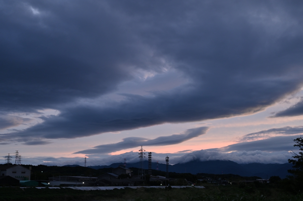| 秋雨前線が南下し、寒冷前線となって午後に通過。 19時の気温は昨日より約5℃低い25.7℃。 撮影地では風も吹いて半袖では肌寒いほど。 真夏から秋へと一気に空気が入れ替わった感じです。 夕方の空には鈴鹿山脈の山麓から始まる層積雲が 広がっていましたが、これらが蒸発するとともに、 細長いつるし雲の大きいものと小さいものが継続し、 日没後は夕焼を背景に美しいシルエットとなりました。 |