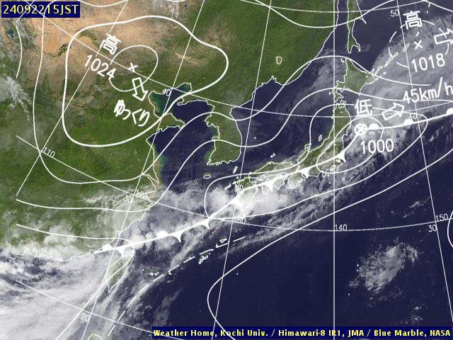 | 地上(高知大学気象情報頁赤外画像と気象庁速報天気図を合成) | |||
