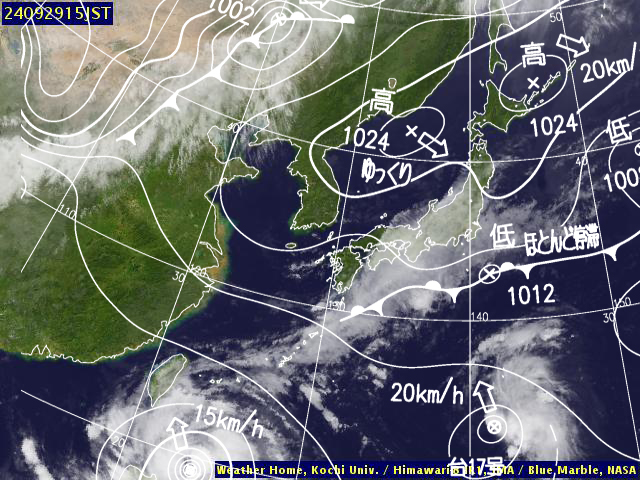 | 地上(高知大学気象情報頁赤外画像と気象庁速報天気図を合成) | |||
